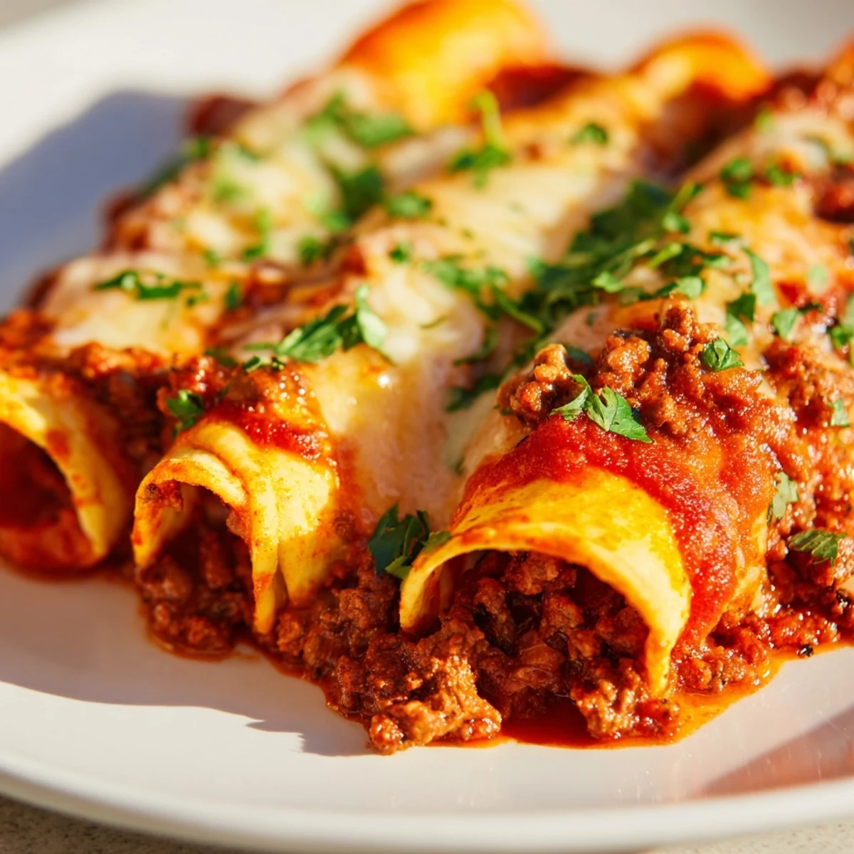 This dish features seasoned ground beef combined with a vibrant, homemade red sauce, wrapped in corn tortillas and topped with melted cheese. The red sauce balances spices like chili powder, cumin, and paprika, simmered to a smooth finish. Baking melds flavors, creating a hearty Tex-Mex classic ideal for family dinners or celebrations. Optional garnishes like cilantro and sour cream add freshness and creaminess to each serving.