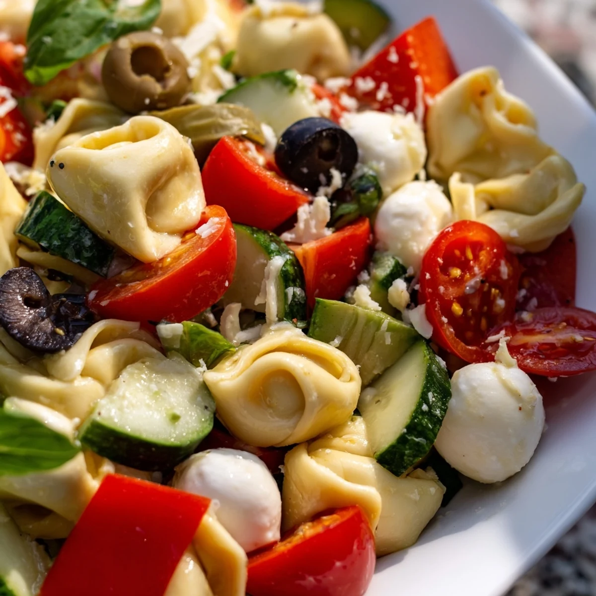 Substitute vegan tortellini and omit the mozzarella and Parmesan. The vegetables and dressing remain naturally plant-based and flavorful.