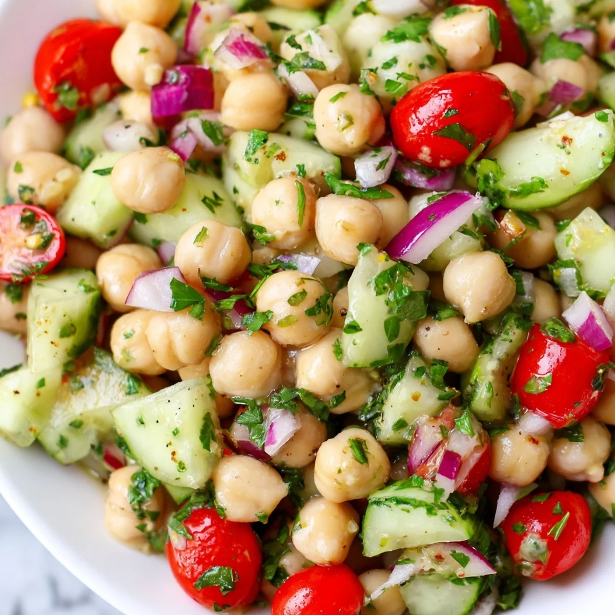 This vibrant Mediterranean-inspired bowl brings together protein-rich chickpeas with crisp cucumber, sweet cherry tomatoes, and zesty red onion. The bright lemon-herb dressing ties everything together with fresh garlic and quality olive oil. Ready in just 15 minutes with no cooking required—perfect for meal prep, potlucks, or quick weekday lunches. Naturally gluten-free, vegan, and packed with plant-based protein.