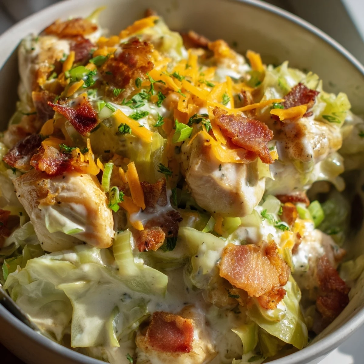 This hearty bowl brings together tender chicken pieces and crispy bacon with thinly sliced cabbage, all enveloped in a rich and creamy homemade ranch sauce. The combination textures create a satisfying meal—crunchy vegetables, succulent meat, and velvety sauce work together perfectly. Ready in just 40 minutes, these bowls deliver comfort food vibes while keeping things low-carb and gluten-free. The ranch seasoning adds familiar tangy flavors that everyone loves, making it an ideal choice for easy weeknight dinners.