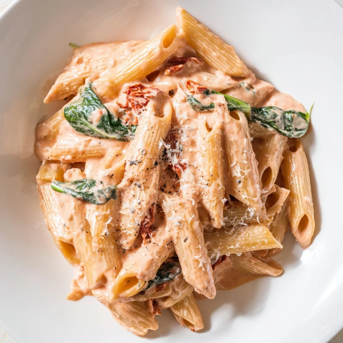 This one-pan pasta delivers restaurant-quality creaminess with just 10 minutes of prep. The sun-dried tomatoes provide concentrated umami flavor while fresh spinach adds vibrant color and nutrients. As the pasta cooks directly in vegetable broth, it releases starches that naturally thicken the cream sauce, creating that perfect velvety consistency that clings to every bite of penne or fusilli.