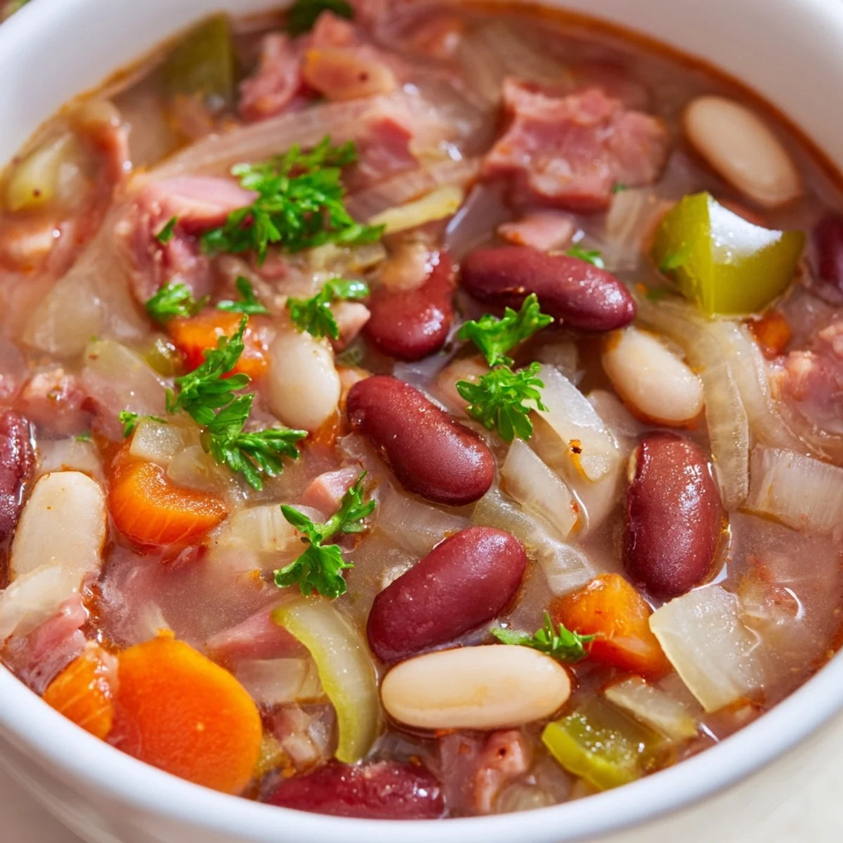This Creole-inspired bean soup combines creamy red and white beans with smoky diced turkey ham and fresh vegetables like onion, bell pepper, and carrots. Flavored with smoked paprika, thyme, and a hint of cayenne, it simmers gently to meld rich southern flavors. Ideal for a cozy, nutritious meal that’s both dairy- and gluten-free, it’s easy to prepare and perfect served with crusty bread or rice. Garnish with fresh parsley and hot sauce for an extra kick.