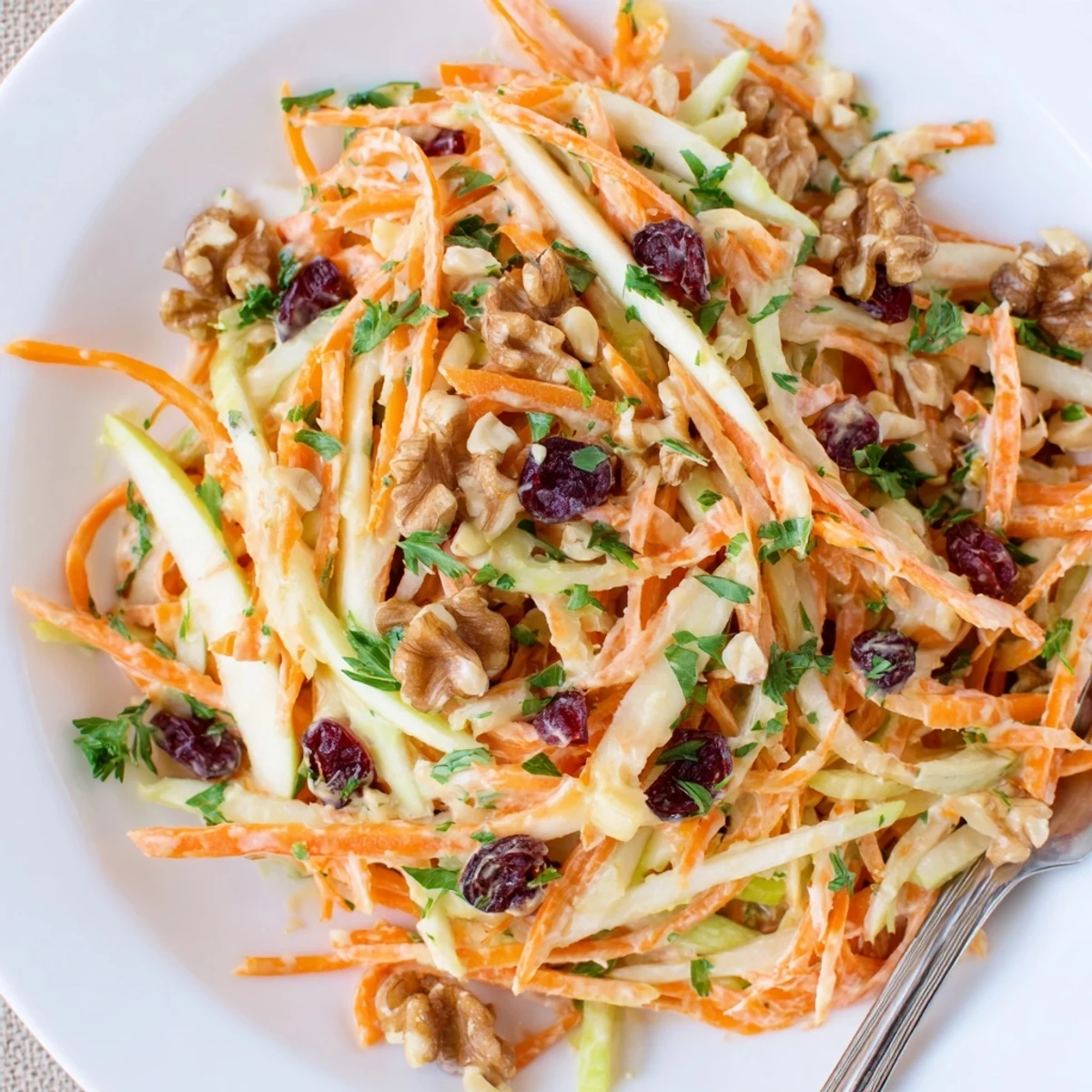 Crunchy julienned apples and carrots combine with thinly sliced celery, chopped walnuts and sweet raisins, finished with chopped parsley. A creamy citrus dressing of Greek yogurt, mayonnaise, orange and lemon juice, honey and Dijon balances sweetness and tang. Toss just before serving for maximum crunch; refrigerate briefly if needed. Swap nuts or use plant-based yogurt and mayo for a dairy-free version.