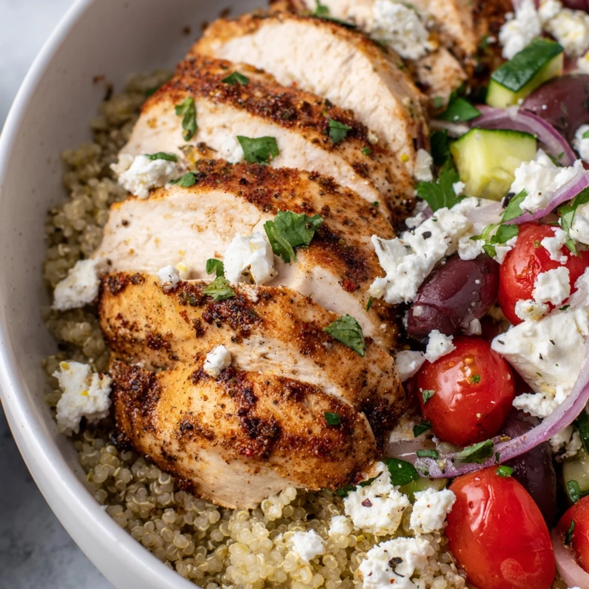 - Divide the fluffy quinoa among four bowls and arrange the sliced chicken, cherry tomatoes, cucumber, red onion, olives, and feta on top. Drizzle with the dressing and finish with a generous sprinkle of fresh parsley.