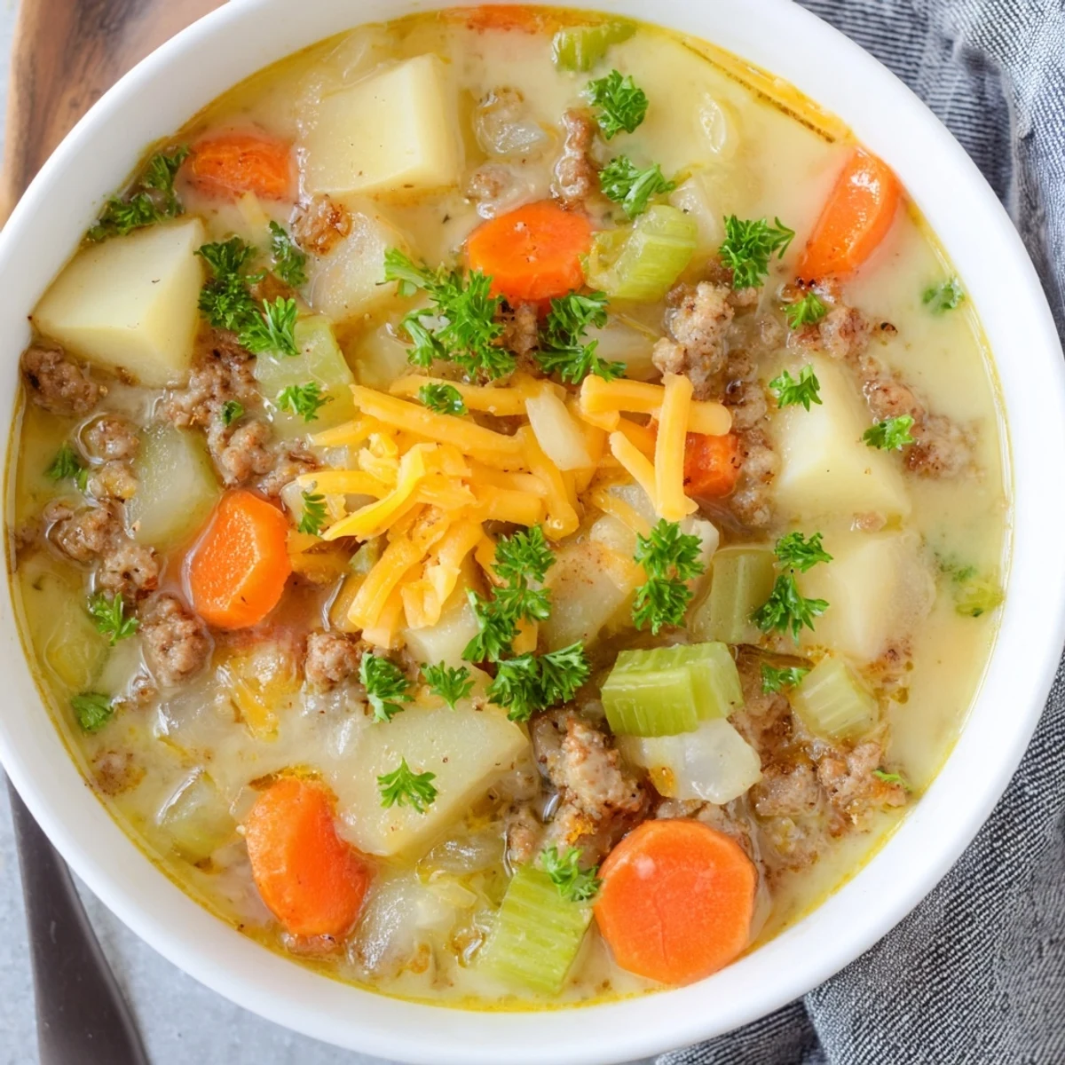This hearty soup combines savory pork sausage with fork-tender potatoes, aromatic onions, carrots, and celery in a rich, creamy broth. The mild pork sausage provides deep flavor while the vegetables add texture and nutrients. Ready in just 50 minutes, this gluten-free American classic serves four hungry people perfectly.